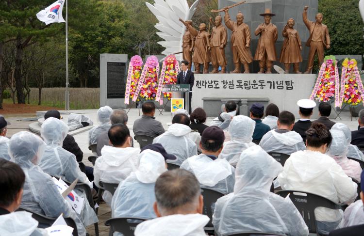 Ȳ±â¿¬ Àü¶ó³²µµÁö»ç ±ÇÇÑ´ëÇàÀÌ 10ÀÏ Àü³² Ç×Àϵ¶¸³¿îµ¿±â³äž¿¡¼ ¿¸° ¡®Á¦107Áֳ⠴ëÇѹα¹ÀÓ½ÃÁ¤ºÎ¼ö¸³ ±â³ä½Ä¡¯¿¡¼ Âü¼®ÀÚµé°ú µ¶¸³±º°¡¸¦ Á¦Ã¢Çϰí ÀÖ´Ù.