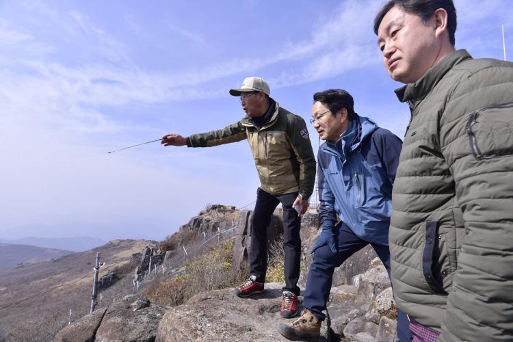 | °±âÁ¤ ±¤ÁÖ±¤¿ª½ÃÀåÀÌ 4ÀÏ ¿ÀÀü ¿ÃÇØ ù ¹«µî»ê Á¤»ó °³¹æÇà»ç¿¡ Âü¿©ÇØ Å½¹æ°´µé°ú ¹«µî»ê Á¤»ó¿¡ µµÂøÇÏ¸ç ¼ÕÀ» Èçµé°í ÀÖ´Ù |