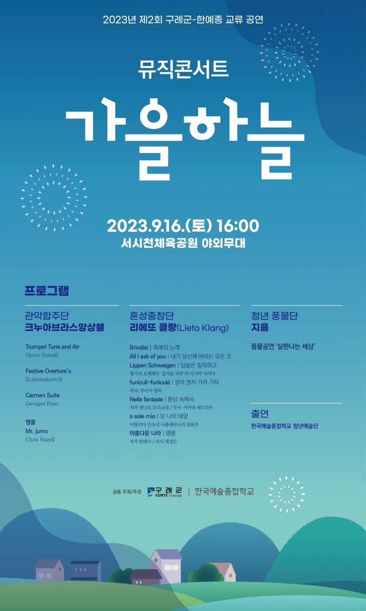±¸·Ê±ºÀº ¡¸2023³â Á¦2ȸ ±¸·Ê±º-ÇÑ¿¹Á¾ ±³·ù °ø¿¬ - ¹ÂÁ÷ÄܼƮ(music concert) <°¡À»ÇÏ´Ã>¡¹À» ¿À´Â 9¿ù 16ÀÏ(Åä) ¿ÀÈÄ 4½Ã ¼½ÃõüÀ°°ø¿ø ¾ß¿Ü¹«´ë¿¡¼ °³ÃÖÇÑ´Ù.