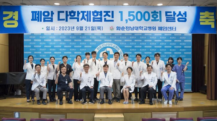 ȼøÀü³²´ëº´¿ø Æó¾Ï ´ÙÇÐÁ¦ÇùÁø 1,500ȸ ´Þ¼ºÀ» ±â³äÇϱâ À§ÇØ ÃÖ±Ù Á¤¿ë¿¬ º´¿øÀå(¾ÕÁÙ ¿ÞÂÊ¿¡¼ ¼¼ ¹øÂ°)À» ºñ·ÔÇØ Æó¾Ï¼¾ÅÍ ¿ÀÀÎÀç ¼¾ÅÍÀå(¾ÕÁÙ °¡¿îµ¥) µî ¼Ò¼Ó ÀÇ·áÁøµéÀÌ ¿©¹ÌȦ¿¡¼ ±â³ä ÃÔ¿µÀ» Çϰí ÀÖ´Ù.