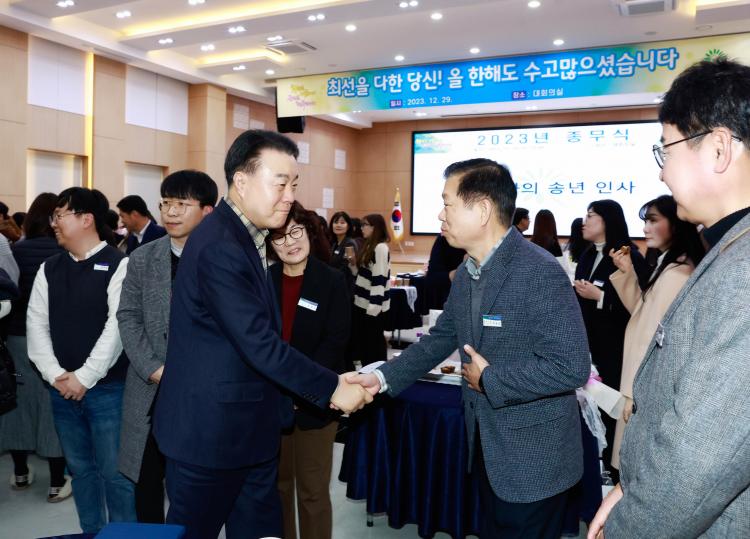 À̳¯ Á¾¹«½ÄÀº ±×µ¿¾ÈÀÇ Æ²¿¡¼ ¹þ¾î³ª ÀÚÀ¯·Î¿î ºÐÀ§±âÀÇ ½ºÅĵù Çü½ÄÀ¸·Î ÁøÇàµÇ¾úÀ¸¸ç, ¡®2023 ȼø±º °øÁ÷ÀÚ ÇÔ²² °É¾î¿Â ¿©Á¤¡¯À» ÁÖÁ¦·Î Á¦ÀÛÇÑ ¿µ»óÀ» »ó¿µÇØ ±×°£ Á÷¿øµéÀÇ ¿Á¤°ú ¼º°ú¸¦ °øÀ¯Çß´Ù.
