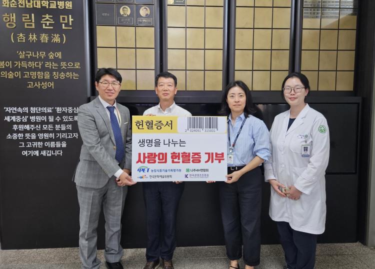³ªÁֽà ¼Ò¼Ó ±â°ü ÀÓÁ÷¿øµéÀÌ È¼øÀü³²´ëÇб³º´¿ø(º´¿øÀå ¹ÎÁ¤ÁØ)¿¡¼ Ä¡·á¹Þ°í Àִ ȯÀÚµéÀ» À§ÇØ ÇåÇ÷ÁõÀ» ±âºÎÇß´Ù.