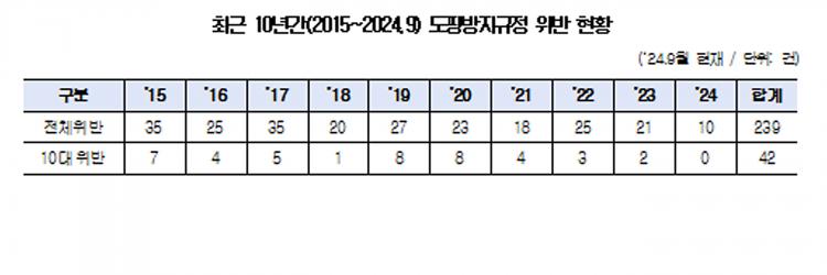 ÃÖ±Ù 10³â°£(2015~2024.9) µµÇιæÁö±ÔÁ¤ À§¹Ý ÇöȲ