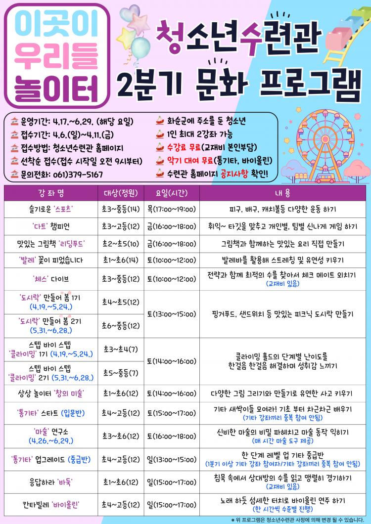 À̹ø 2ºÐ±â ÇÁ·Î±×·¥Àº û¼Ò³âµéÀÌ Ã¢ÀǷ°ú ÀÚ±â Ç¥Çö·ÂÀ» Ű¿ï ¼ö ÀÖµµ·Ï ½ºÆ÷Ã÷¡¤¿ä¸®¡¤¾Ç±â µî ´Ù¾çÇÑ ºÐ¾ßÀÇ °Á¸¦ ¿î¿µÇϸç, ¼ö·Ã°ü ÀÌ¿ë û¼Ò³âÀÇ °ü½É»ç¿Í ¿ä±¸¸¦ ¹Ý¿µÇß´Ù.