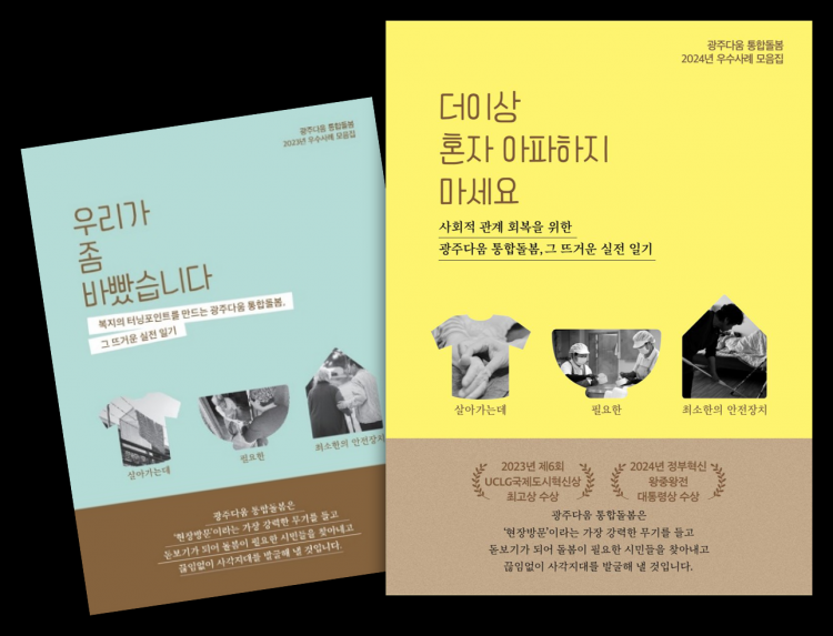 ±¤ÁÖ±¤¿ª½Ã(½ÃÀå °±âÁ¤)´Â ¡®±¤ÁÖ´Ù¿ò ÅëÇÕµ¹º½¡¯À» ½ÇÇàÇÑ °ø¹«¿ø°ú µ¹º½ ¼ºñ½º Á¾»çÀÚ µîÀÇ ÇöÀå¸ñ¼Ò¸®¸¦ ´ãÀº µÎ ¹øÂ° »ç·ÊÁý ¡®´õ ÀÌ»ó È¥ÀÚ ¾ÆÆÄÇÏÁö ¸¶¼¼¿ä¡¯¸¦ ÃÖ±Ù ¹ß°£Çß´Ù. ÀÌ »ç·ÊÁýÀº 2024³â ÅëÇÕµ¹º½ Ȱµ¿ »ç·ÊÁýÀ¸·Î, Áö³ÇØ »ç·ÊÁý ¡®¿ì¸®°¡ Á» ¹Ù»¦½À´Ï´Ù¡¯¿¡ ÀÌÀº µÎ ¹øÂ° ¹ß°£ÀÌ´Ù.