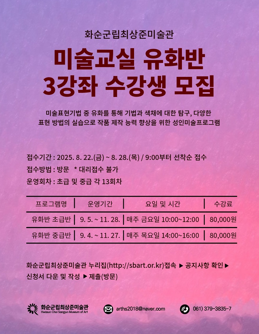 Ãʱ޹ÝÀº À¯ÈÀÇ ±âº» Àç·á »ç¿ë¹ý, º× ÅÍÄ¡ ¿¬½À, »öä ÀÌ·Ð µî ±âÃÊÀûÀÎ À̷аú ½Ç½ÀÀ» Áß½ÉÀ¸·Î ±×¸²¿¡ ´ëÇÑ µÎ·Á¿òÀ» ¾ø¾Ö°í, âÀÛÀÇ Áñ°Å¿òÀ» ´À³¥ ¼ö ÀÖµµ·Ï ¿î¿µµÇ¸ç, Áß±Þ¹ÝÀº ÀÚÀ¯·Î¿î Ç¥ÇöÀ» À§ÇÑ ±¸µµ ±¸¼º, Áú°¨ Ç¥Çö ±â¹ý, °³¼º ÀÖ´Â ÀÛǰ ¿¬Ãâ µî ÇÑ ´Ü°è ³ôÀº ¼öÁØÀÇ Ã¢ÀÛ °æÇèÀ» ÅëÇØ ÀÚ½ÅÀÇ ½ºÅ¸ÀÏÀ» ã¾Æ°¡´Â °úÁ¤À¸·Î ¿¹¼úÀû ÀھƸ¦ È®ÀåÇØ ³ª°¥ ¼ö ÀÖµµ·Ï ÁöµµÇÑ´Ù.