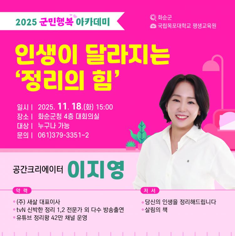 À̹ø °¿¬¿¡¼ ÀÌÁö¿µ °»ç´Â ´Ü¼øÇÑ °ø°£ Á¤¸®¸¦ ³Ñ¾î, »ý°¢°ú °ü°è, »îÀ» Á¤¸®ÇÏ´Â Èû¿¡ ´ëÇØ °¿¬ÇÒ ¿¹Á¤ÀÌ´Ù. Á¤¸®¸¦ ÅëÇØ ºÒÇÊ¿äÇÑ °ÍµéÀ» ºñ¿ì°í Àڽſ¡°Ô ÁýÁßÇÏ´Â ¹æ¹ý, ±×¸®°í ÀÛÀº Á¤¸® ½À°üÀÌ ÀλýÀÇ ¹æÇâÀ» ¹Ù²Ü ¼ö ÀÖÀ½À» »ý»ýÇÑ »ç·Ê¿Í ÇÔ²² µé·ÁÁÙ ¿¹Á¤ÀÌ´Ù.