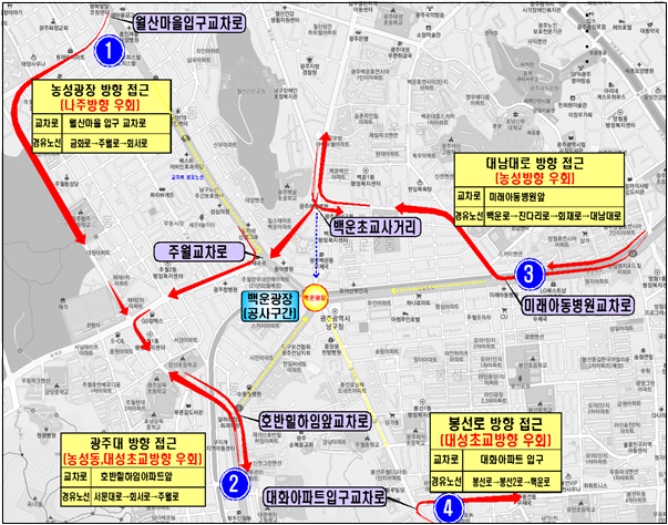 ÅëÁ¦ ±¸°£ Â÷·® ¿ìȸµµ·Î´Â ¡ã³ó¼º±³Â÷·Î¿¡¼ ¹é¿î±¤Àå ¹æÇâ ¡æ ¿ù»ê¸¶À» ÀÔ±¸ ±³Â÷·Î¿¡¼ ¾ç±ÃÀå ¹æÇ⠡㱤ÁÖ´ë¿¡¼ ¹é¿î±¤Àå ¡æ È£¹ÝÈúÇÏÀÓ ±³Â÷·Î¿¡¼ ¾ç±ÃÀå ¹æÇâ ¡ã³²±¤ÁÖ(ºÀ¼±¡¤¹æ¸²)¿¡¼ ¹é¿î±¤Àå ¡æ ¹Ì·¡¾Æµ¿º´¿ø ±³Â÷·Î¿¡¼ ±âµ¶º´¿ø(¼öÇǾƿ©°í) ¹æÇâ ¡ãºÀ¼±µ¿¿¡¼ ¹é¿î±¤Àå ¹æÇâ ¡æ ´ëÈ¾ÆÆÄÆ® ÀÔ±¸ ±³Â÷·Î¿¡¼ ºÀ¼±Áß¾Ó·Î(ºÀ¼±Ãʱ³) ¹æÇâ µîÀÌ´Ù.