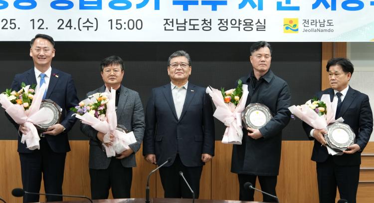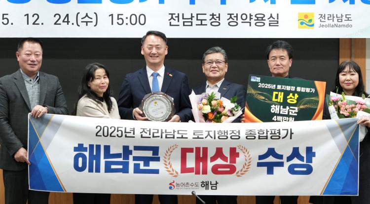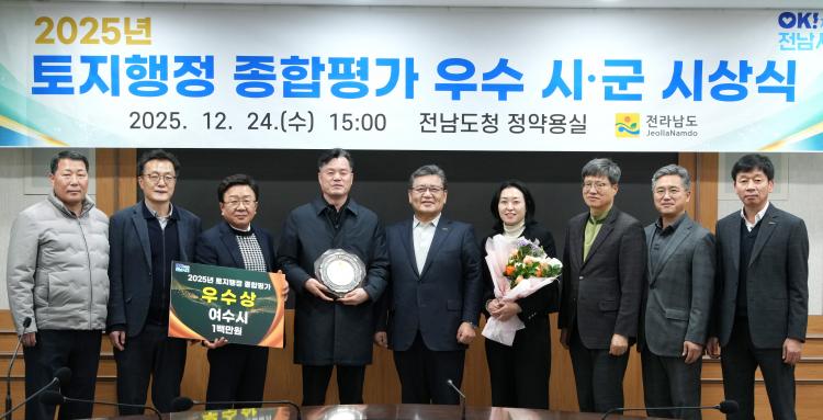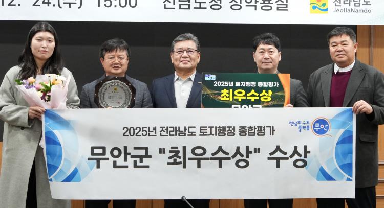 24ÀÏ Àü³²µµÃ» Á¤¾à¿ë½Ç¿¡¼ ¡®2025³â ÅäÁöÇàÁ¤ Á¾ÇÕÆò°¡ ¿ì¼ö ½Ã¡¤±º ½Ã»ó½Ä¡¯ÀÌ ¿¸° °¡¿îµ¥ ¹®Àαâ Àü¶ó³²µµ °Ç¼³±³Åë±¹ÀåÀÌ ¿ì¼ö ½Ã¡¤±º¿¡°Ô »óÀå ¹× ½Ã»ó±ÝÀ» ¼ö¿©ÇÑ µÚ ±â³äÃÔ¿µÀ» Çϰí ÀÖ´Ù.