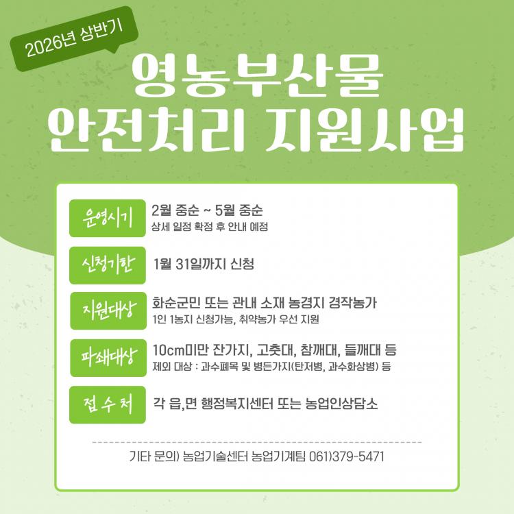 ȼø±ºÀº ¿µ³óºÎ»ê¹° ¾ÈÀüó¸® Áö¿ø´ÜÀ» »ó¹Ý±â(2¿ù~5¿ù)¿Í ÇϹݱâ(11¿ù~12¿ù)·Î ³ª´©¾î ¿î¿µÇÒ °èȹÀÌ´Ù. À̸¦ ÅëÇØ ³ó¾÷Àε鿡°Ô 1ÀÎ 1³óÁö¸¦ ±âÁØÀ¸·Î Àܰ¡Áö, °íÃå´ë µî ³ó¾÷ºÎ»ê¹° ÆÄ¼â ÀÛ¾÷À» Áö¿øÇϸç, °í·É³ó¾÷Àΰú Ãë¾à°èÃþÀ» ¿ì¼±À¸·Î ¹«»ó Áö¿øÇÒ ¿¹Á¤ÀÌ´Ù.