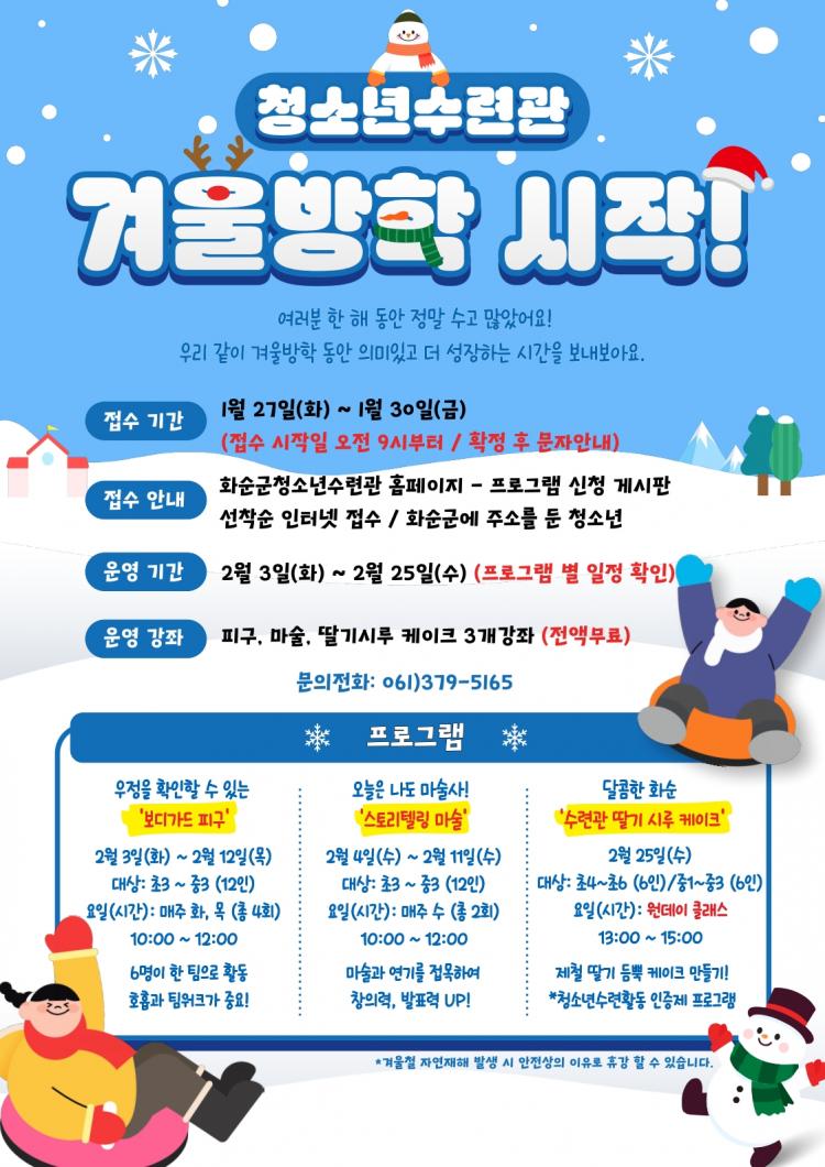 Âü°¡ ´ë»óÀº ȼø±º¿¡ ÁÖ¼Ò¸¦ µÐ û¼Ò³âÀ̸ç, ½ÅûÀº 1¿ù 27ÀÏ(È)ºÎÅÍ 30ÀÏ(±Ý)±îÁö ȱºÃ»¼Ò³â¼ö·Ã°ü ´©¸®Áý(https://hwasunyouth.kr/) ÇÁ·Î±×·¥ ½Åû °Ô½ÃÆÇ¿¡¼ ÇÏ¸é µÈ´Ù. Á¢¼ö ½ÃÀÛ Ã¹³¯ ¿ÀÀü 9½ÃºÎÅÍ ¼±Âø¼øÀ¸·Î ¸ðÁýÇϰí ÃÖÁ¾ ¼±Á¤ÀÚ¿¡°Ô´Â ¹®ÀÚ·Î °³º° ¾È³»µÈ´Ù.