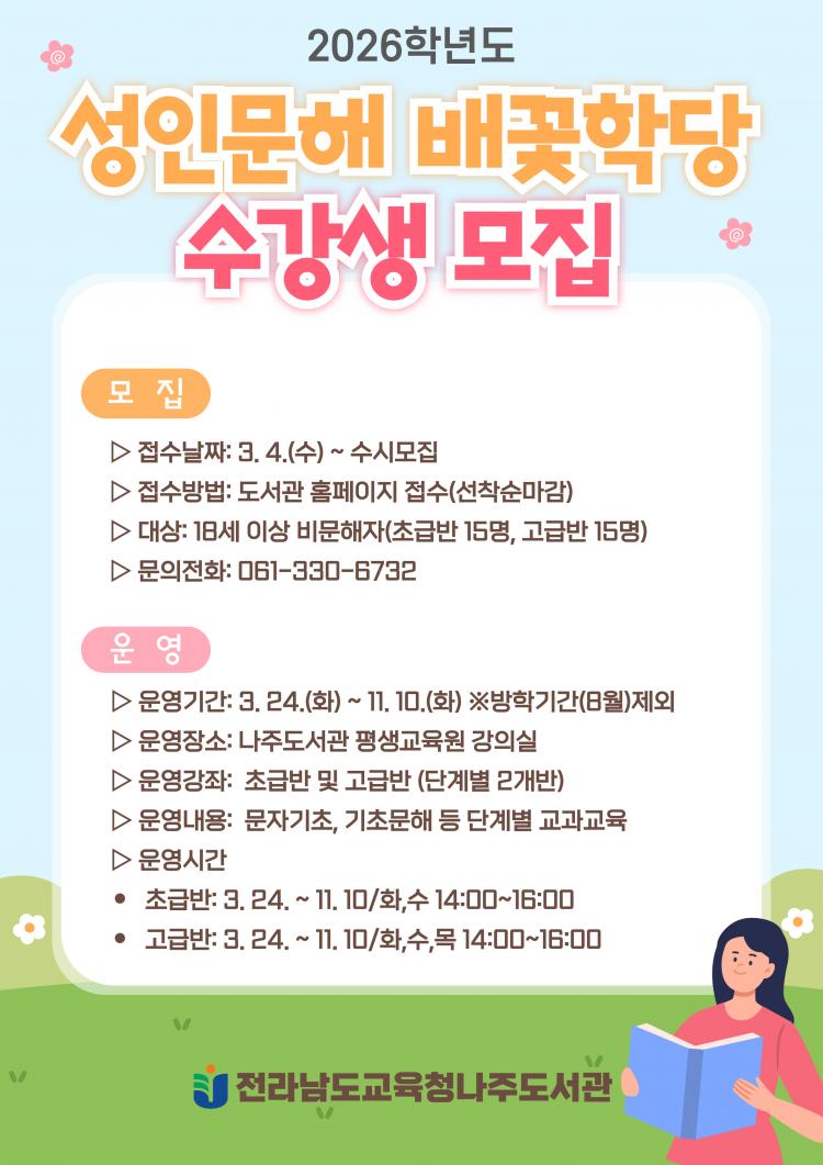 Àü¶ó³²µµ±³À°Ã»³ªÁÖµµ¼°ü(°üÀå ±èÀǰï)Àº ¿À´Â 3¿ù 24ÀϺÎÅÍ ¼ºÀÎ ÇнÀÀÚÀÇ ±âÃÊ ¹®ÇØ ¿ª·®À» °ÈÇØ »îÀÇ ÁúÀ» ³ôÀ̰í Áö¿ª»çȸ Âü¿©¸¦ È®´ëÇϱâ À§ÇØ ¼ºÀι®ÇØ ¹è²ÉÇдçÀ» ¿î¿µÇÑ´Ù.