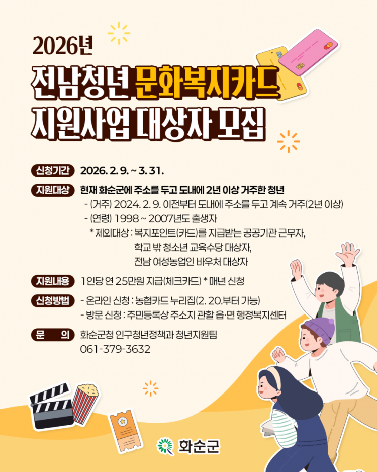 ȼø±º(±º¼ö ±¸º¹±Ô)Àº Áö¿ª û³âµéÀÇ Àڱ⠰è¹ß°ú ¹®È»ýȰ ±âȸ¸¦ È®´ëÇϱâ À§ÇØ ¡®2026³â Àü³² û³â ¹®Èº¹ÁöÄ«µå Áö¿ø»ç¾÷¡¯ ´ë»óÀÚ¸¦ ¿À´Â 3¿ù 31ÀϱîÁö ¸ðÁýÇÑ´Ù°í ¹àÇû´Ù.